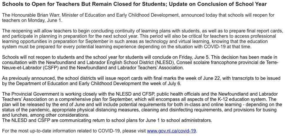 Kelly Anne Roberts On Twitter Schools Will Reopen On June 1st For Teachers In Nl But Remain Closed To Students Reopening To Allow Teachers To Prepare Final Report Cards Ntvnewsnl Https T Co Bcjvc8okkl
