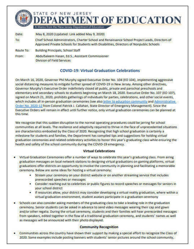 New Jersey Department Of Education Provides Guidance On Commencement Ceremonies